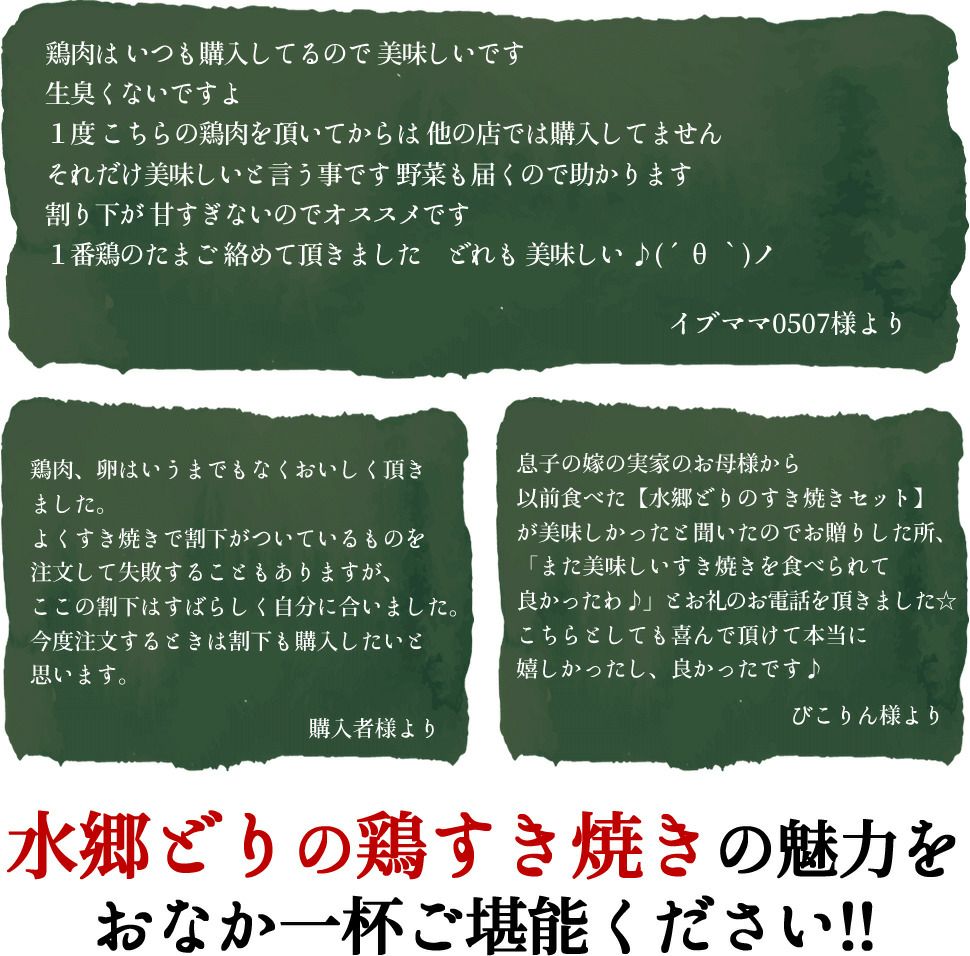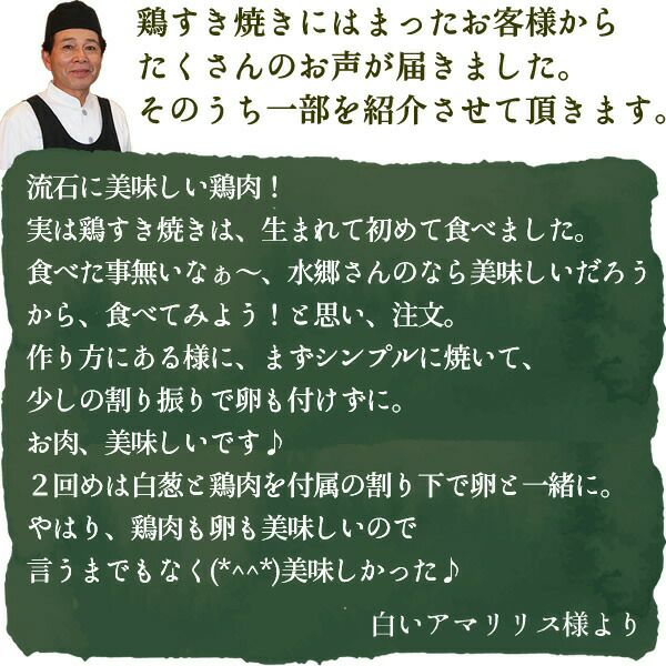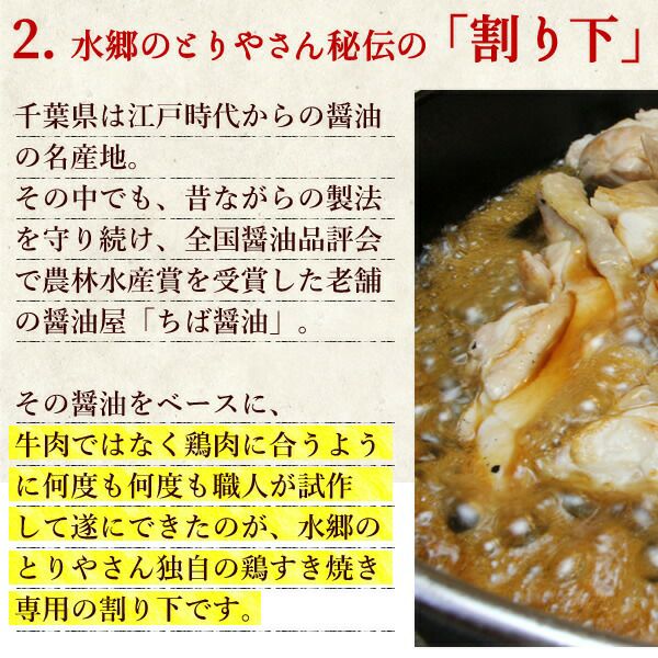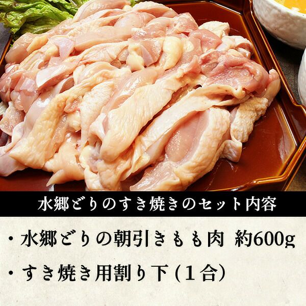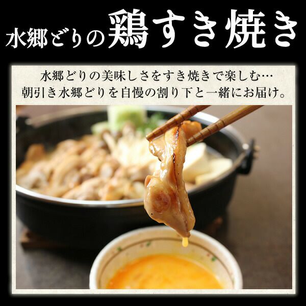 《お肉を追加したい方に》すき焼き用にカットした水郷どりと割り下のセットです。秘伝の割り下で水郷どりの甘みをおなか一杯ご堪能ください。