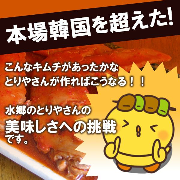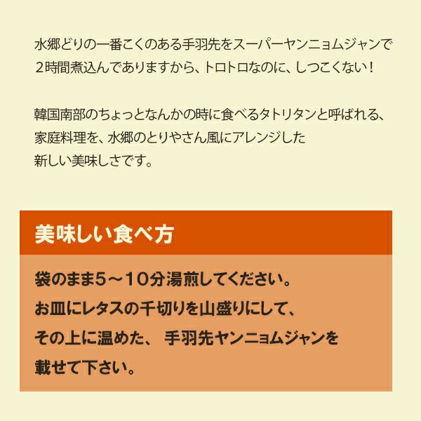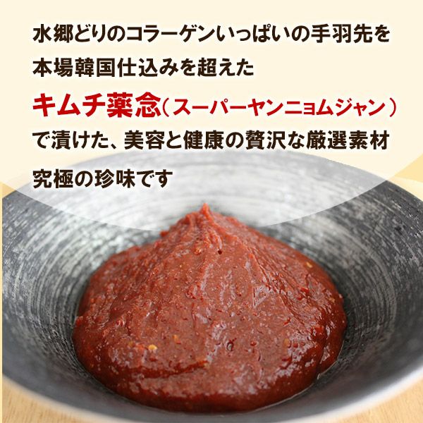 手羽先ヤンニョムジャン 本場韓国を超えた「水郷どりの手羽先を付け込んだ」贅沢キムチです。とろとろの食感なのにしつこくない! 鶏肉専門店だからこそできる水郷のとりやさんの新しいキムチへの挑戦によって生まれた自慢の逸品です♪