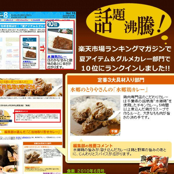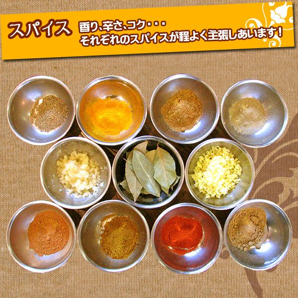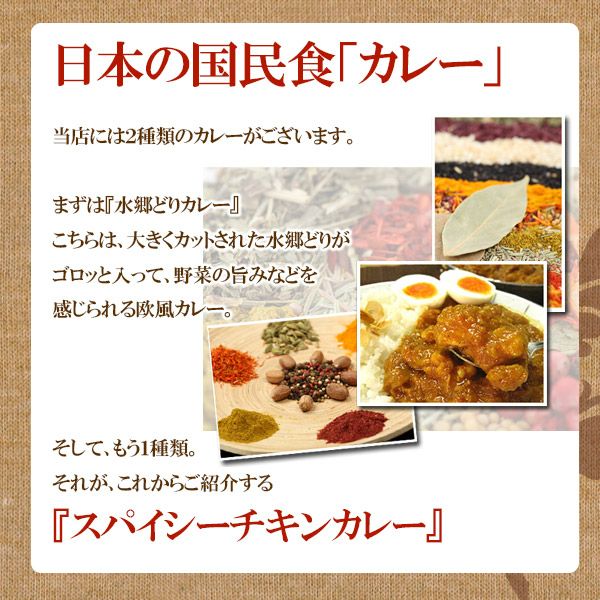 スパイシーチキンカレー 水郷どりのチキンカレーが野菜の旨みなどを感じられる欧風カレーなら、スパイシーチキンカレーはターメリックやウコン、ガラムマサラなど多数のスパイスをきかせた本格カレー。 スパイスの刺激的な辛さにトマトの酸味と玉ねぎの甘みが加わって、感涙もののスパイシーなチキンカレーが完成しました!