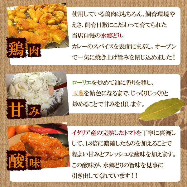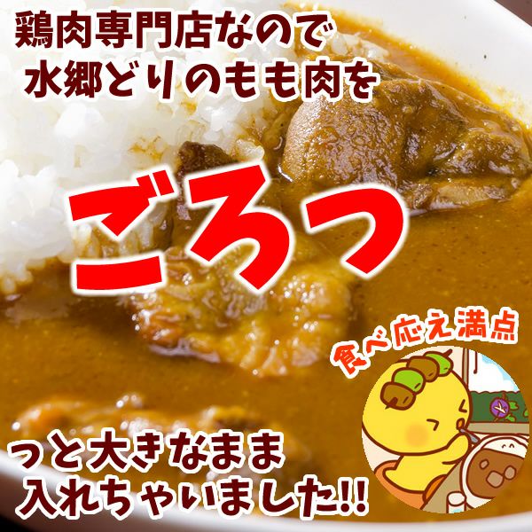 水郷どりチキンカレー 「水郷どり」のもも肉を、ゴロッと大きなままいれちゃいました! 煮込みすぎると鶏肉の旨味が逃げてしまうので、スパイスと一緒に炒め、ソースと合わせてからはほとんど煮込みません。 だから、鶏肉が旨いんです! 酸味と甘みが口の中に広がったあと、スパイスの香り、素材の旨みがじんわりと押し寄せてきます♪