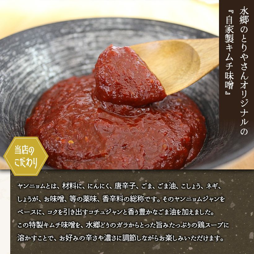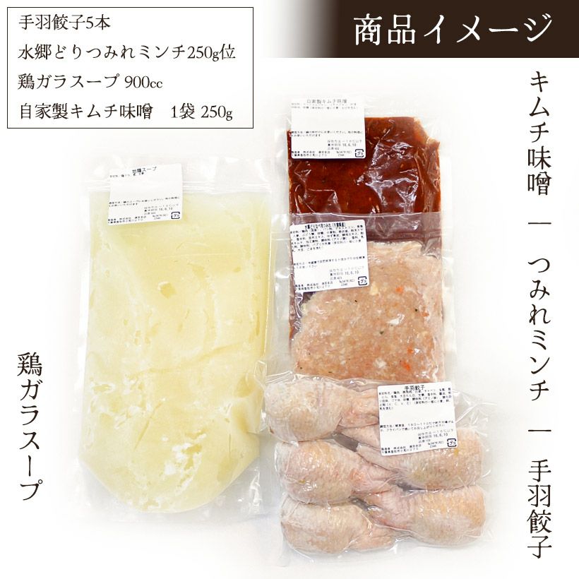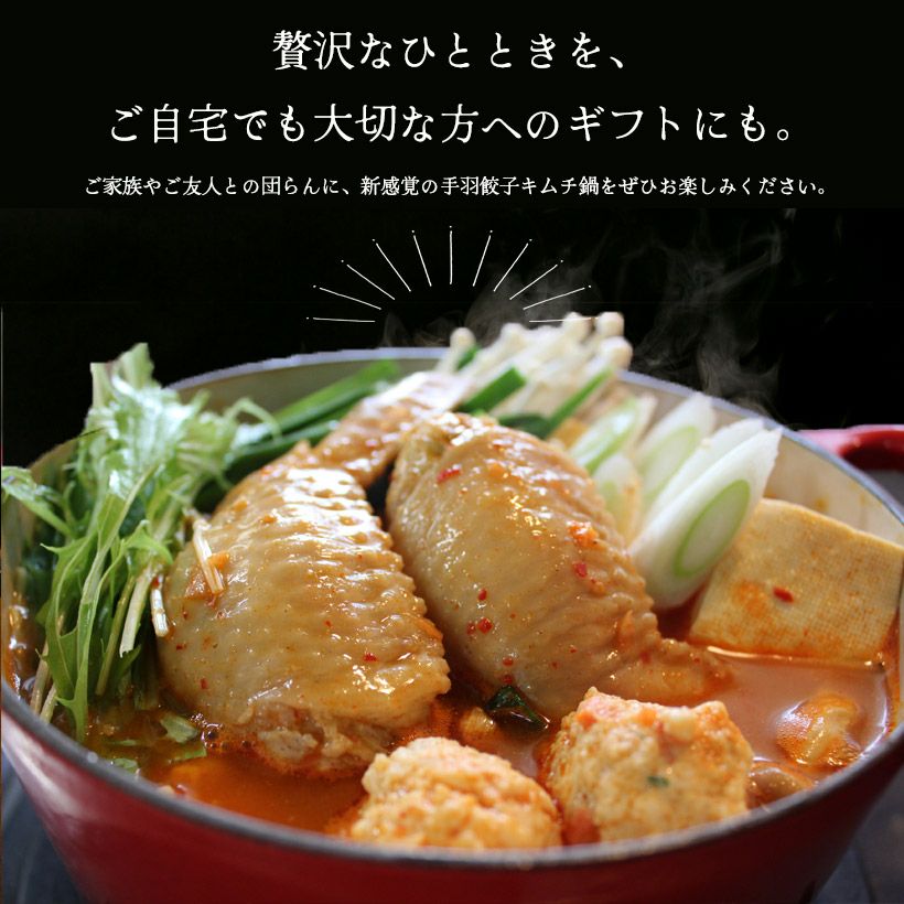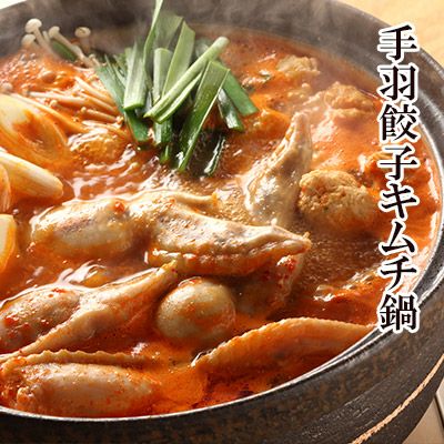 手羽餃子キムチ鍋 2年連続楽天グルメ大賞受賞!8秒に1本売れる「手羽餃子」を水郷のとりやさん自家製のキムチ味噌スープで味わって頂きます。 自慢のヤンニョムジャンに、コクを出すためにコチュジャンやゴマ油を加えて、水郷どりの鶏ガラスープで仕上げたピリ辛の鍋スープは手羽餃子のジューシーな旨味をとことんまで引き立てます!