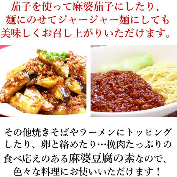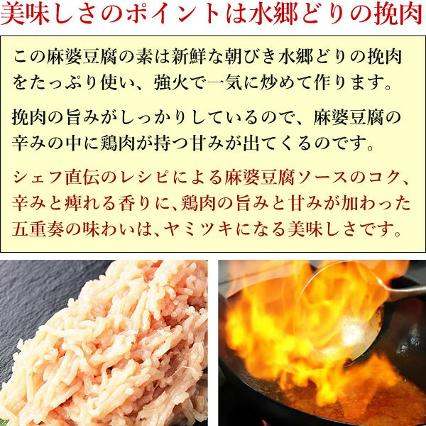 ![]() 麻婆豆腐の素 四川料理を代表する料理と言えば麻婆豆腐。 当店の麻婆豆腐の素には、新鮮な水郷どりの挽肉と鶏ガラをたっぷり使った極上のチキンスープを使用。 辛みと痺れと旨みが複雑に絡み合う贅沢な味わいです!