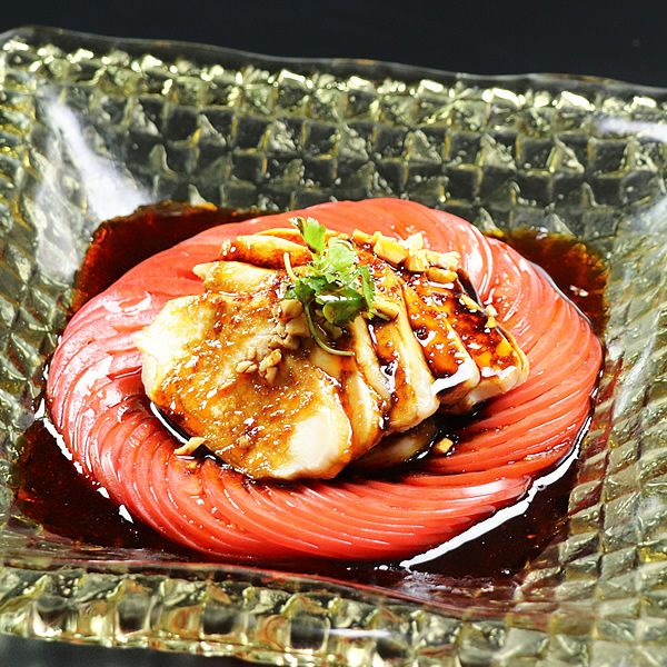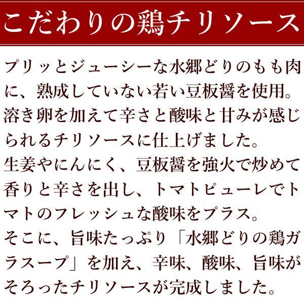 ![]() 鶏チリソース 新鮮な水郷どりもも肉に、若い豆板醤を使用し、溶き卵を加えて仕上げたシェフ直伝レシピ。 旨味がたっぷり染み出した「水郷どりの鶏ガラスープ」も加えた辛味、酸味、旨味の三拍子そろったチリソースは絶品!