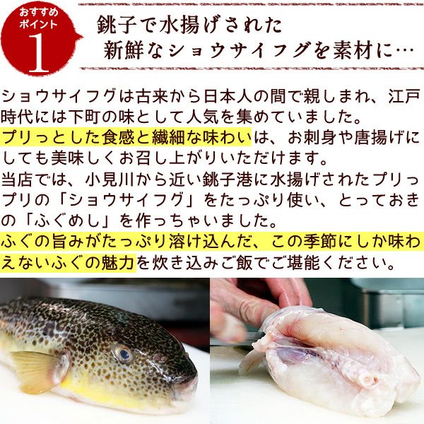 他の画像を見る 料亭の味をご家庭で・・・上品で繊細なふぐの炊き込みご飯です 100袋限定!ふぐの炊き込みご飯(2合用) [ ふぐ飯 フグ 河豚 ショウサイフグ ] 当店特別価格 ¥ 1,490 税込 在庫切れ 再入荷お知らせ お気に入りに登録する
