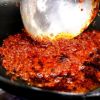 そして、豆板醤や甜面醤、豆鼓をしっかりと強火で炒めて、香り、辛味を出したシェフ独自の麻婆豆腐ソースを作り、そこに先ほど炒めた水郷どりの挽肉と鶏ガラスープを加えて、さらにじっくり炒めると痺れるような辛みと旨みが絡み合う最幸の麻婆豆腐の素のできあがり。