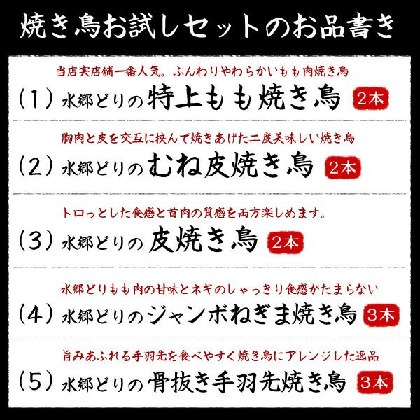 他の画像を見る テレビや雑誌でも紹介されている人気の焼き鳥をまずはお試し! 【送料無料】焼き鳥お試しセット! 定価 ¥ 3,650 のところ 当店特別価格 ¥ 3,480 税込 カートに入れる お気に入りに登録する