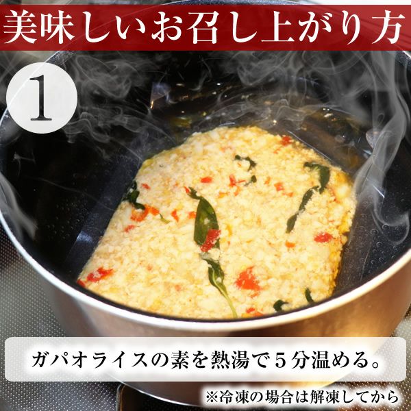 - ガパオライスの素を熱湯で5分温める。 ※冷凍の場合は解凍してから