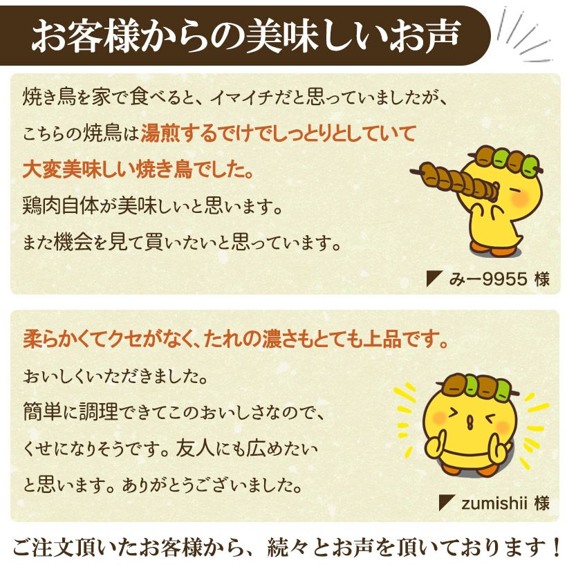 こんにちは、水郷のとりやさんの須田です。家で焼き鳥を焼くのは大変ですよね!! そこで、焼き鳥の自宅へのお取り寄せ・通販なら水郷のとりやさんにお任せ!! お湯ポチャ5分でお家で焼きたての美味しさが楽しめる専門店の焼き鳥がお取り寄せできちゃうんです!! しかも、その焼き鳥は、当店のベテランの職人が1本1本、丁寧に串打ちし、秘伝のタレやこだわりの塩で焼き上げた焼き鳥ッ!! 鶏肉・焼き鳥の専門店ですので、他では味わえない貴重な部位の焼き鳥など、種類も豊富に焼き鳥が自宅にお取り寄せできちゃいます♪ ※バーベキューなどに最適な【生】の焼き鳥(串もの)のお取り寄せはこちらから |
