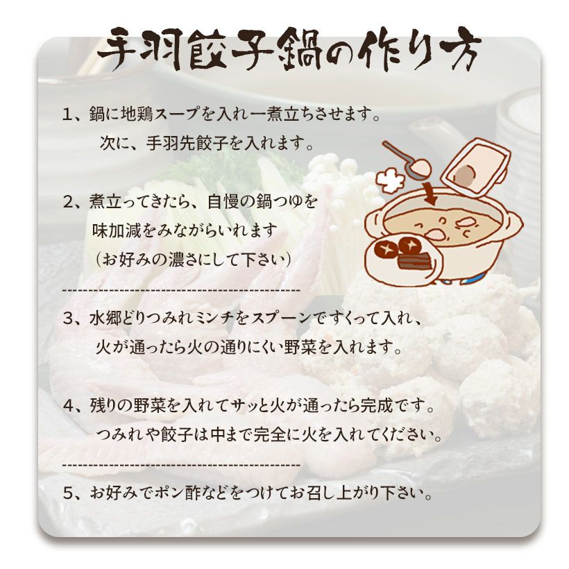 他の画像を見る テレビで紹介されたコラーゲンたっぷり手羽餃子鍋! 【送料無料】手羽餃子鍋セット(2-3人前)[ 元祖 手羽先餃子鍋 ハイブリッド鍋 ]※【 冷凍 限定配送 】※冷蔵限定商品とは同梱できません 別途送料がかかります 冷凍限定 当店特別価格 ¥ 2,980 税込 カートに入れる お気に入りに登録する