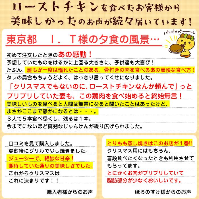 他の画像を見る 蒸し釜で1羽1羽、丁寧に焼き上げられたローストチキン! 送料無料!絶品ローストチキン!特撰丸蒸し焼きローストチキン(2-3名様分)[ クリスマスチキン 丸鶏 丸どり 丸鳥 ] 当店特別価格 ¥ 3,996 税込 カートに入れる お気に入りに登録する
