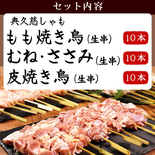 他の画像を見る 奥久慈しゃも3種類の生串が楽しめる送料無料セット 【送料無料】奥久慈しゃも 焼き鳥 生串30本セット 【生・冷凍】 [もも串10本 胸ささみ串10本 皮串10本 ] 奥久慈軍鶏 焼き鳥 やきとり 串もの バーベキュー BBQ 冷凍限定 当店特別価格 ¥ 8,424 税込 詳細を見る お気に入りに登録する
