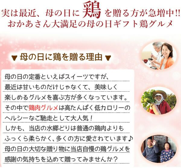 他の画像を見る お母さん、いつもありがとう!母の日★ヘルシーでおいしい自慢の鶏料理を贈ります! 【送料無料】 母の日限定!お母さん喜ぶ 洋風 チキン グルメセット 当店特別価格 ¥ 3,240 税込 在庫切れ 再入荷お知らせ お気に入りに登録する