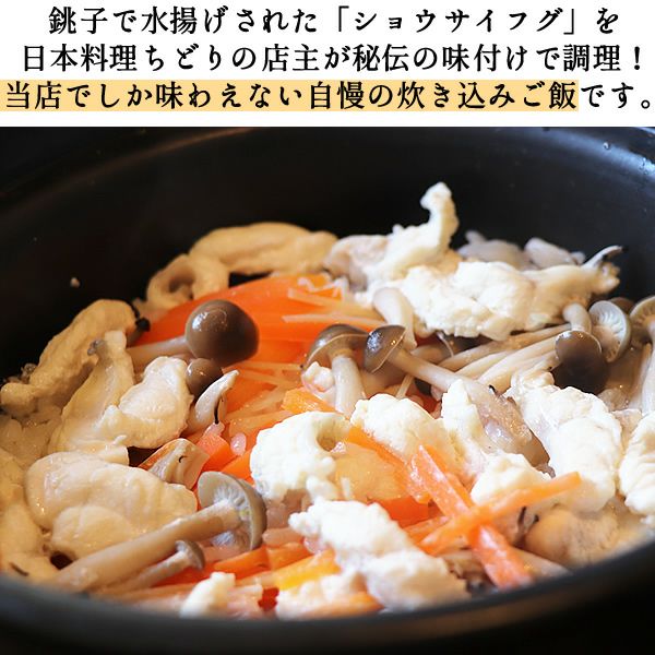 他の画像を見る 料亭の味をご家庭で・・・上品で繊細なふぐの炊き込みご飯です 100袋限定!ふぐの炊き込みご飯(2合用) [ ふぐ飯 フグ 河豚 ショウサイフグ ] 当店特別価格 ¥ 1,490 税込 在庫切れ 再入荷お知らせ お気に入りに登録する