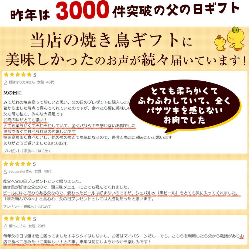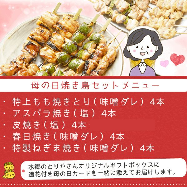 他の画像を見る お母さんいつもありがとう!お父さんも一緒に楽しめる母の日ギフト★調理も簡単な鶏肉専門店の焼き鳥セットを贈ります♪ 【送料無料】 母の日ギフト ★ 夫婦で仲良く楽しめる 母の日 焼き鳥 20本セット 当店特別価格 ¥ 5,400 税込 在庫切れ 再入荷お知らせ お気に入りに登録する