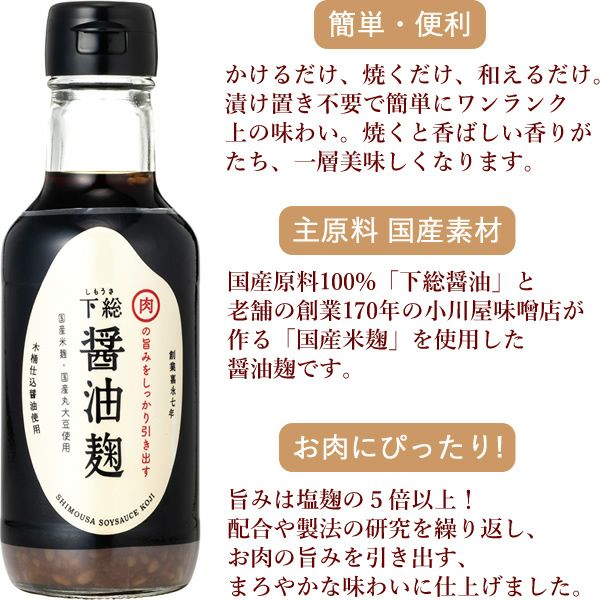 他の画像を見る 醤油の香りと旨みに、米麹の甘みとコクが加わり、食材の旨みを最大限引き立てる発酵調味料です。 肉が旨くなる魔法の調味料 下総醤油麹 (200ml×1) [ちば醤油]※【 常温・冷蔵 限定配送 】※冷凍限定商品とは同梱できません 別途送料がかかります 冷蔵限定 当店特別価格 ¥ 486 税込 在庫切れ 再入荷お知らせ お気に入りに登録する